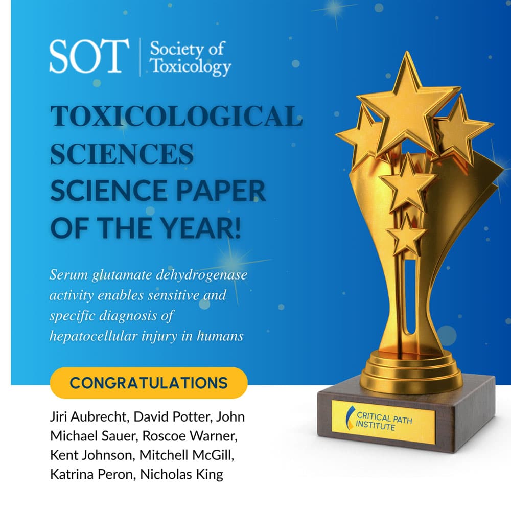 TUCSON, Ariz., March 23, 2026 — Critical Path Institute® (C-Path) announced today that the Society of Toxicology (SOT) has awarded the 2026 Toxicological Sciences Paper of the Year to a landmark study on liver safety biomarkers authored by C-Path researchers and their long-time collaborators. Titled “Serum Glutamate Dehydrogenase Activity Enables Sensitive and Specific Diagnosis of Hepatocellular Injury in Humans,” the winning publication details the validation of glutamate dehydrogenase (GLDH) as a superior precision medicine tool for detecting drug-induced liver injury.